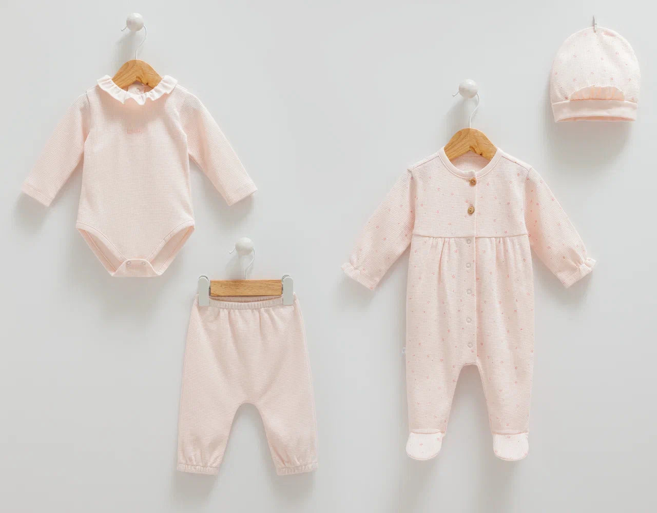 طقم بيبي قطن ٤ قطع أفرهول مع بجامة / ١-٣ أشهر زهري