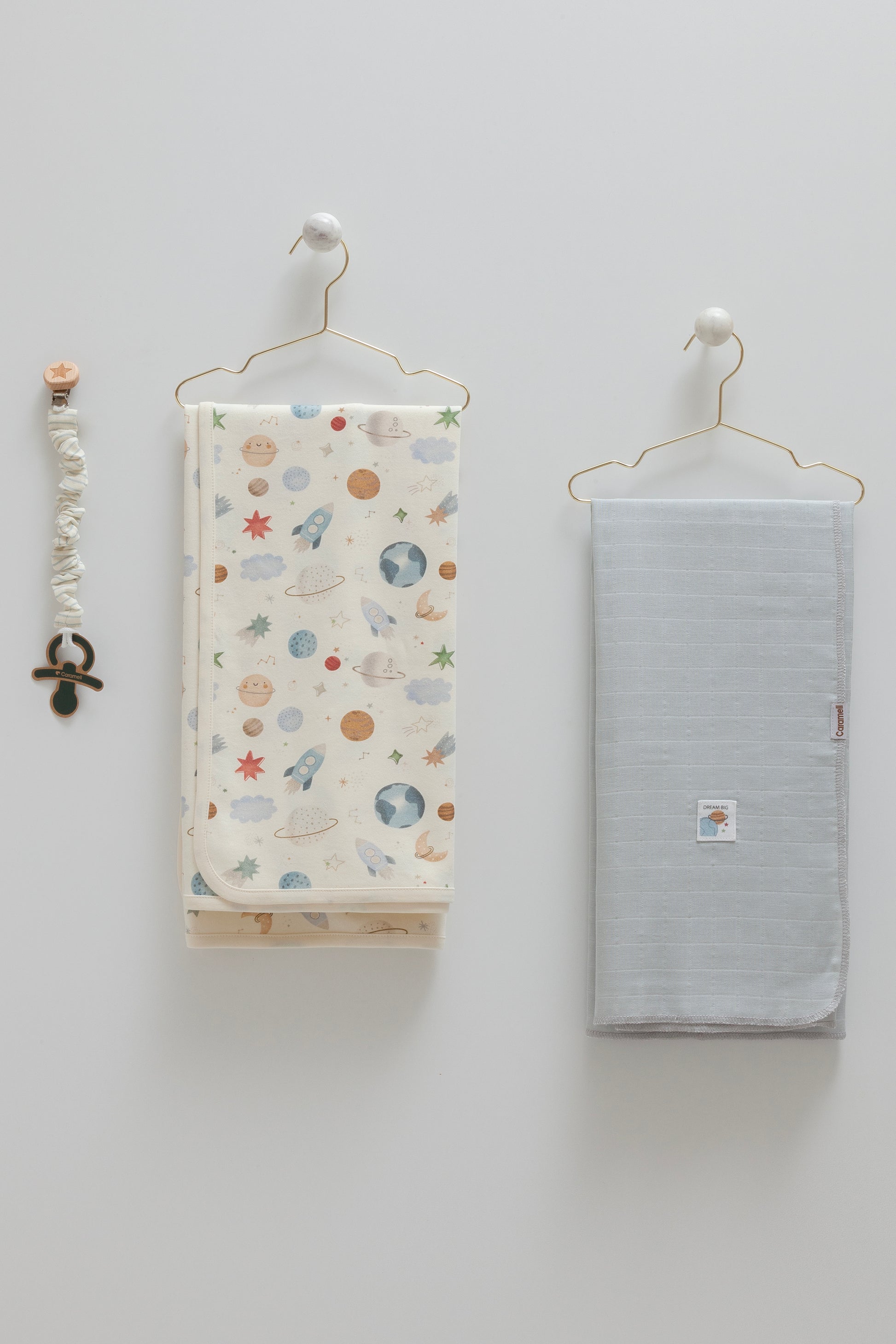طقم كوفليتين قطن و موسيلين مع تعليقة لهاية🪐