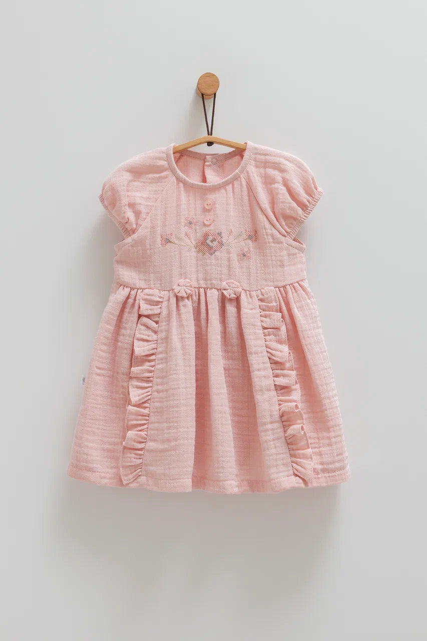 فستان صيفي مطرز خفيف قطن١٠٠٪ زهري ٦-٢٤شهر